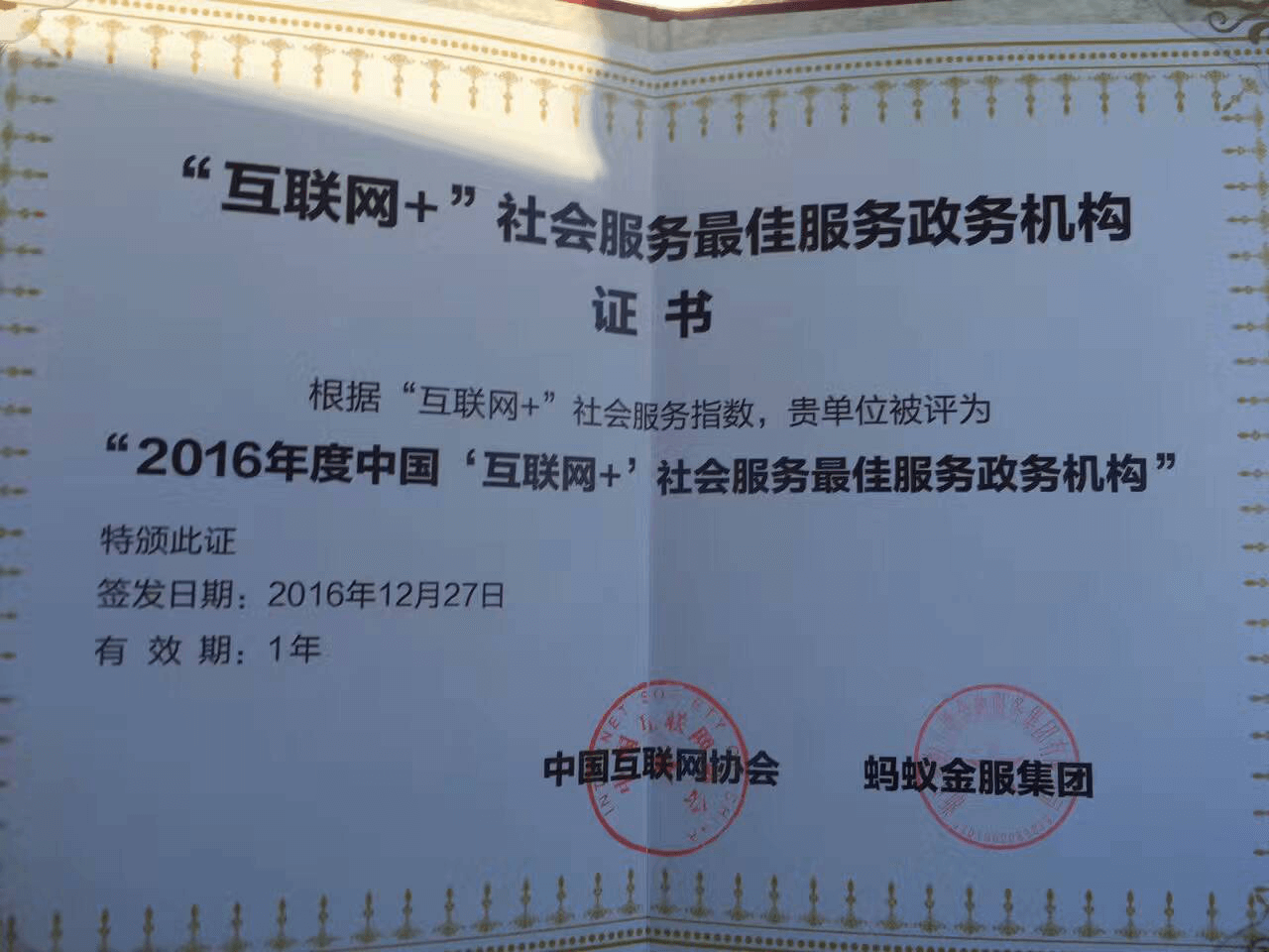 榮獲螞蟻金(jīn)服智慧城(chéng)市(shì)“互聯網+”社會(huì)服務最佳政務機(jī)構殊榮。